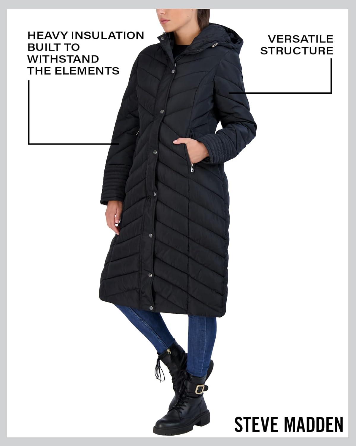 OFFICIALLY LICENSED STEVE MADDEN: Women’s Winter Chevron Maxi Puffer Jacket; Inspired by rock and roll and their New York roots, Steve Madden provides on-trend women and men with an outlet to express their individuality is innovative, daring, and inspiring