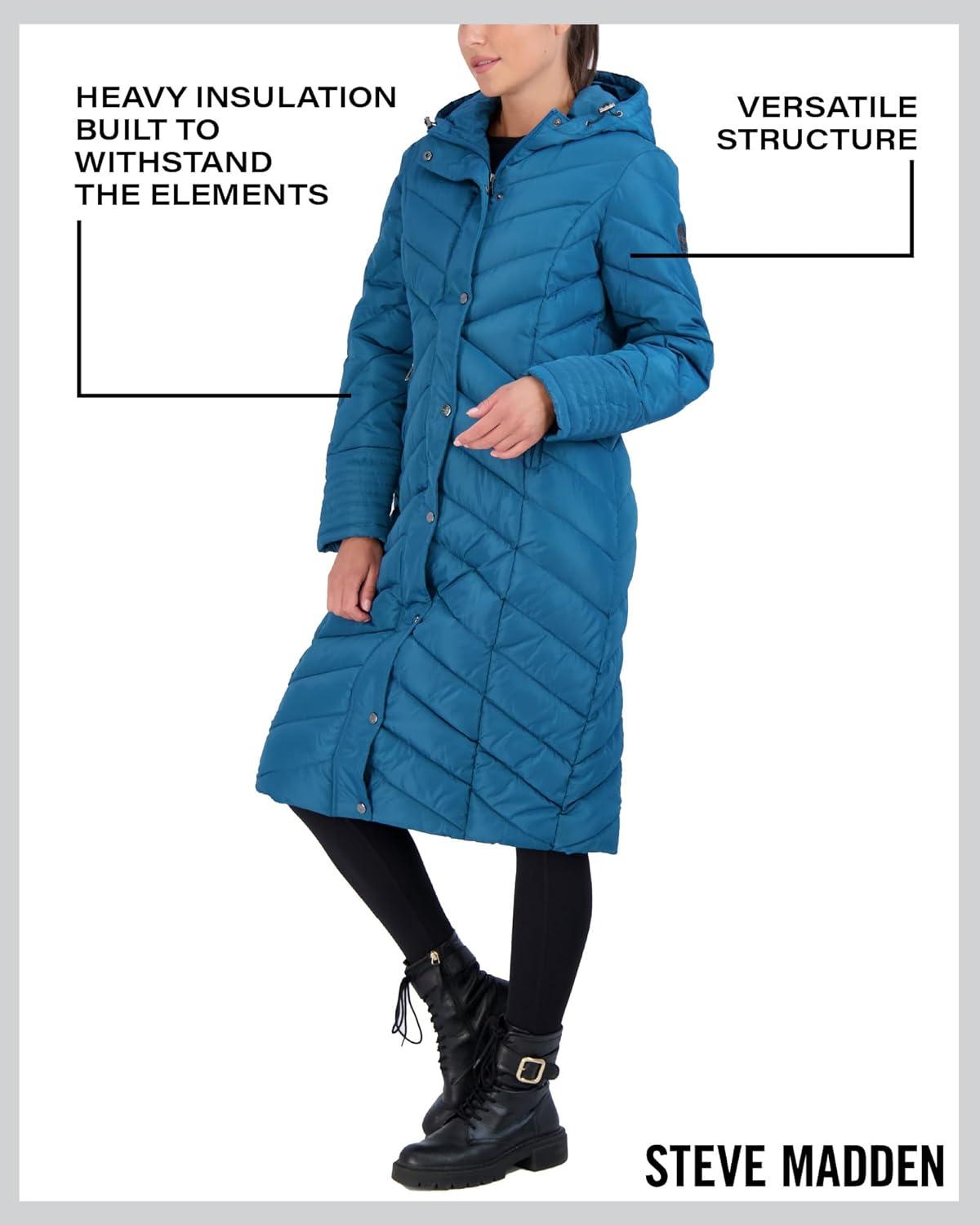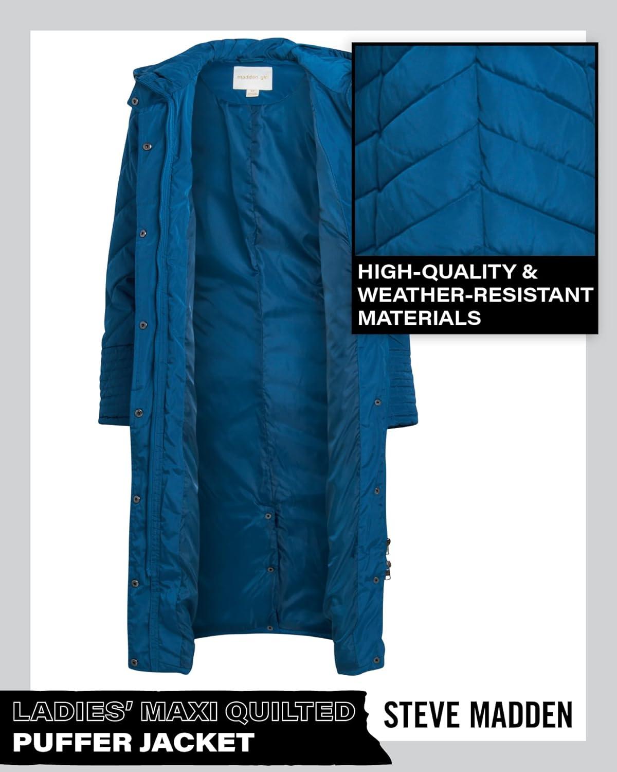 Madden Girl Womens Maxi Puffer Winter Coats - Long Quilted Jackets for Women Weather Resistant Puffer Parka Hooded Jacket(Peacock)