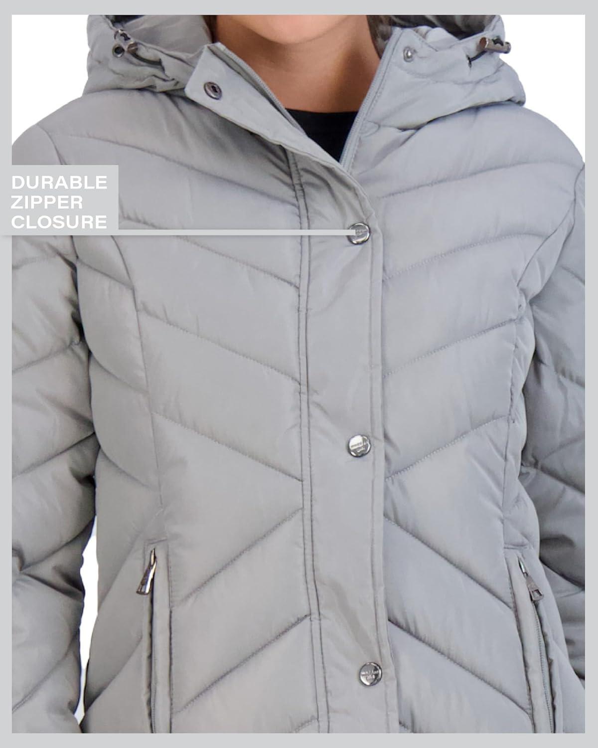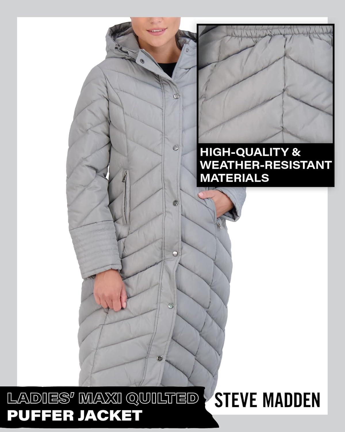 Madden Girl Womens Maxi Puffer Winter Coats – Long Quilted Jackets for Women Weather Resistant Puffer Parka Hooded Jacket(Titanium)