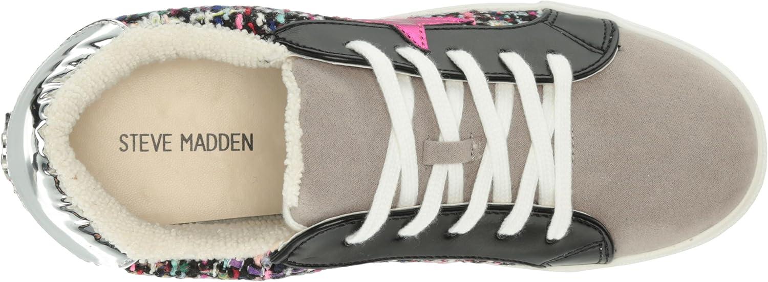 Introducing the Steve Madden Girls' Shoes Rezume Fashion Sneaker – the perfect addition to your little fashionista's wardrobe! These stylish and comfortable sneakers are designed to keep up with her active lifestyle while adding a touch of flair to her outfits. Crafted with high-quality materials, these fashion sneakers feature a durable synthetic upper that's designed to withstand the wear and tear of everyday use. The lace-up and velcro closure options provide a secure and customized fit, while the cushioned footbed ensures all-day comfort. The Steve Madden Kids Rezume Fashion Sneaker boasts a sleek and modern design that's sure to turn heads. This classic silhoette comes in a variety of color options featuring glitter and metallic detailing, creating a chic and edgy look that's perfect for any occasion. The versatile design pairs well with jeans, leggings, dresses, and more, making it a must-have in any stylish girl's closet. Whether she's running around the playground or hanging out with friends, the Steve Madden Girls' Shoes Rezume Fashion Sneaker will keep her looking and feeling her best. So why wait? Add these sneakers to your cart today and let your little one step out in style!