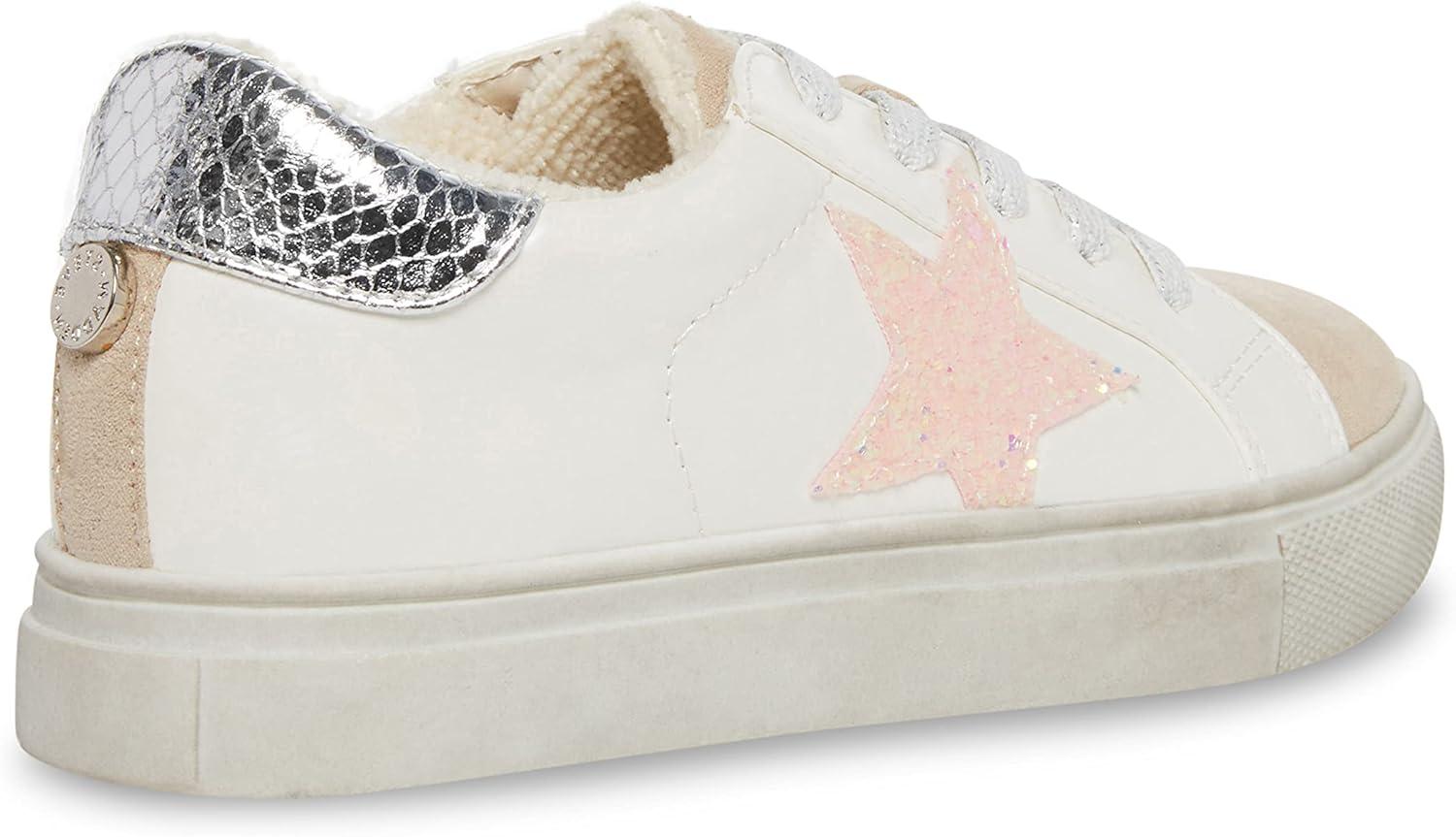 Introducing the Steve Madden Girls' Shoes Rezume Fashion Sneaker – the perfect addition to your little fashionista's wardrobe! These stylish and comfortable sneakers are designed to keep up with her active lifestyle while adding a touch of flair to her outfits. Crafted with high-quality materials, these fashion sneakers feature a durable synthetic upper that's designed to withstand the wear and tear of everyday use. The lace-up and velcro closure options provide a secure and customized fit, while the cushioned footbed ensures all-day comfort. The Steve Madden Kids Rezume Fashion Sneaker boasts a sleek and modern design that's sure to turn heads. This classic silhoette comes in a variety of color options featuring glitter and metallic detailing, creating a chic and edgy look that's perfect for any occasion. The versatile design pairs well with jeans, leggings, dresses, and more, making it a must-have in any stylish girl's closet. Whether she's running around the playground or hanging out with friends, the Steve Madden Girls' Shoes Rezume Fashion Sneaker will keep her looking and feeling her best. So why wait? Add these sneakers to your cart today and let your little one step out in style!