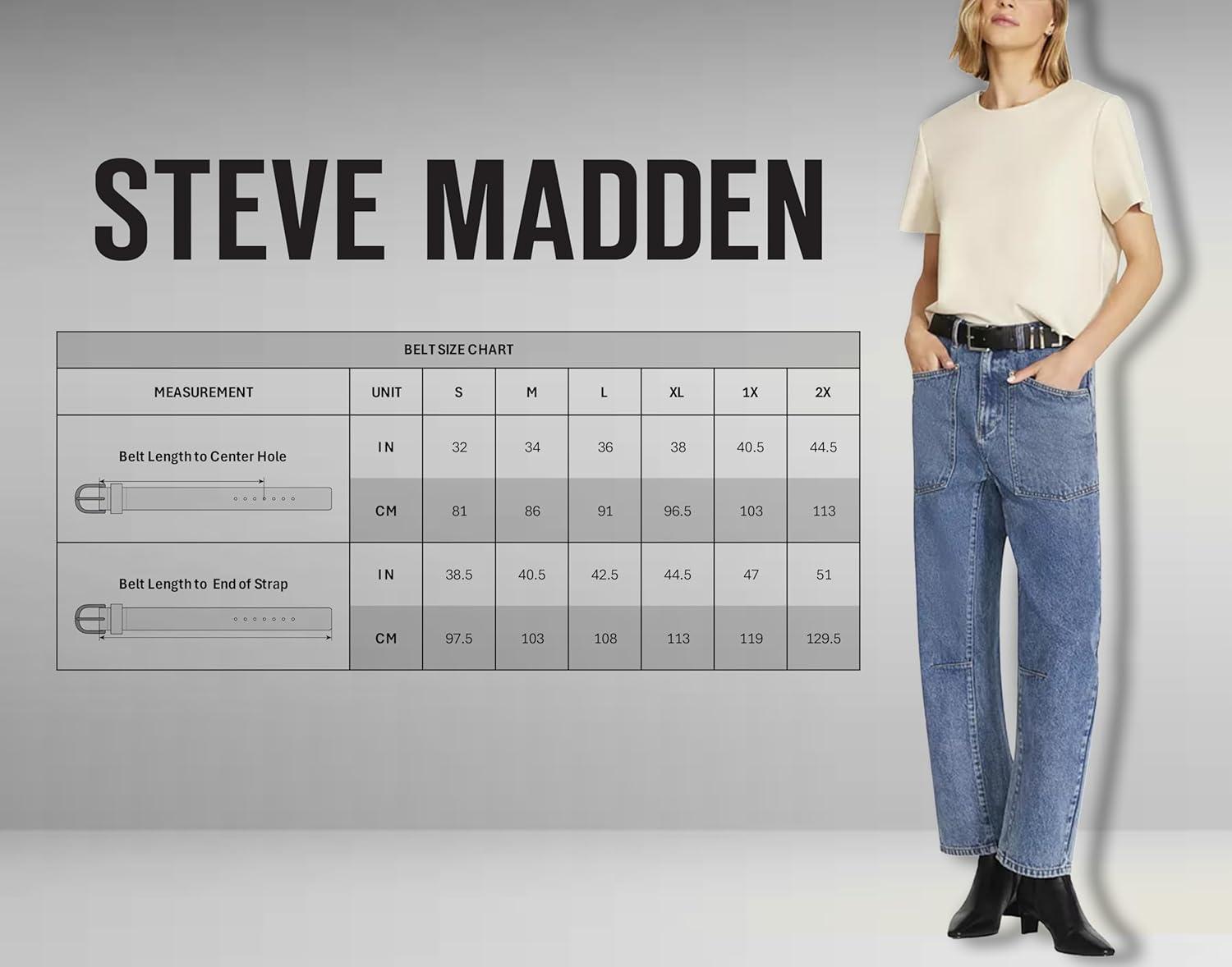 As a fashion-forward company, Steve Madden offers a diverse collection of belts, ranging from classic and timeless designs to trend setting materials and hardware. We believe everyone should have one of our belts in their rotation to complement their unique style, which is why we offer a wide selection in a variety of colors, textures, and sizes to ensure the perfect fit for every individual. If you’re dressing up for a special occasion or just adding a finishing touch to your look, our belts are perfect to take you from casual to formal, day or night.  They’re a must-have accessory for your wardrobe!