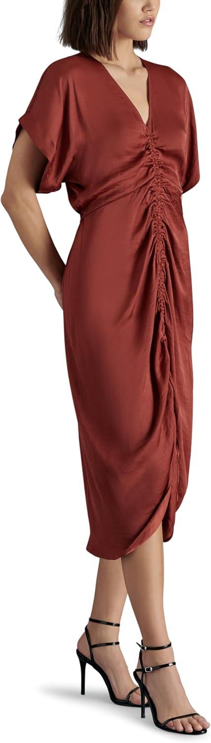 The AIMEE midi dress matches fluttery short dolman sleeves with gathered center front seam for an effortlessly elegant effect. The V-neck and high low hem create a dynamic silhouette for this sophisticated Steve Madden style.
