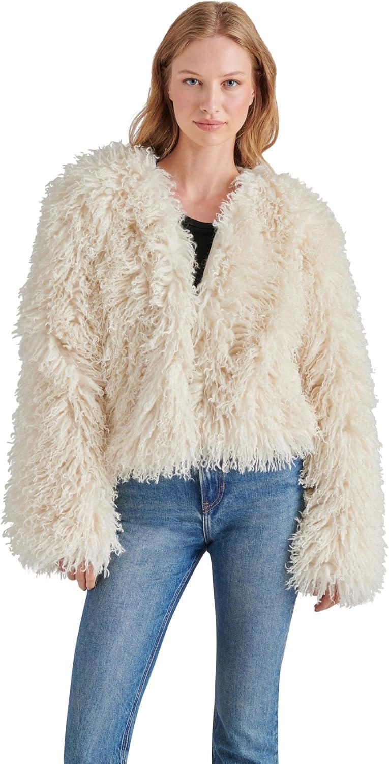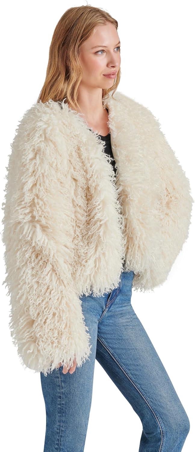 Oversized collarless jacket in fuax Mongolian fur.