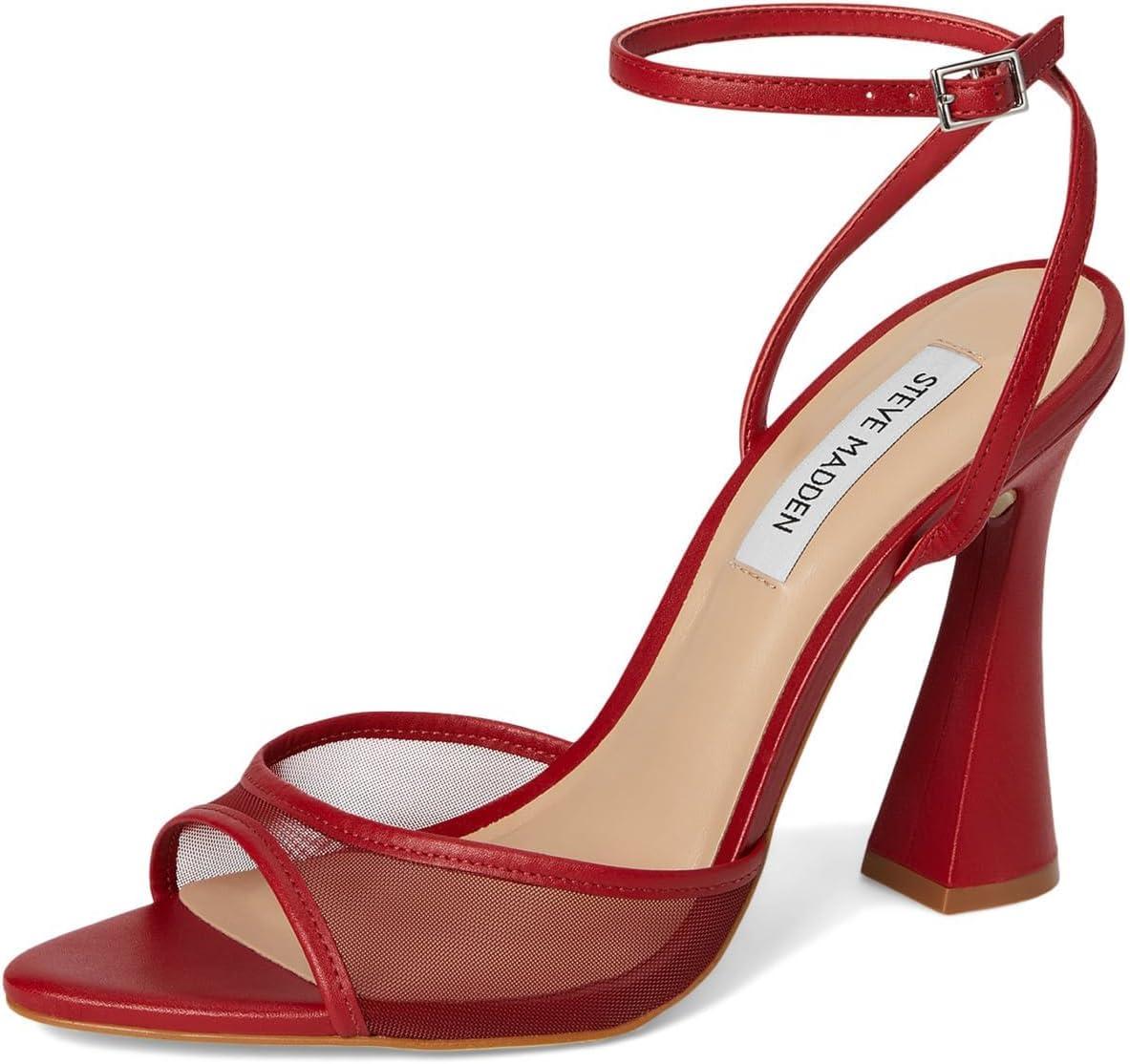 Look glorius int he flawless beauty of the Steve Madden® Beki flared heel sandals designed with an open toe and buckle detail running along a sleek ankle strap.