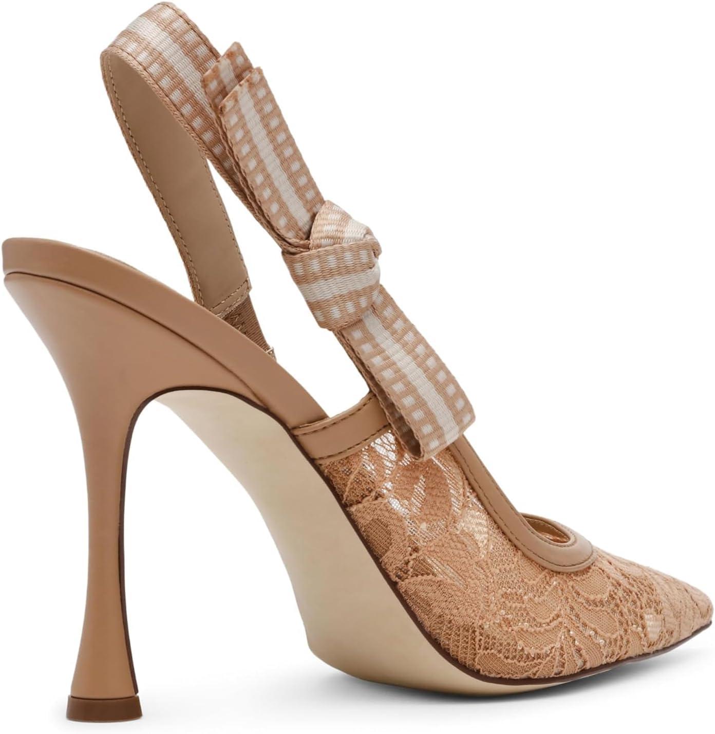 A grosgrain ribbon wraps around the slingback strap of the BRI point toe stiletto pump and finishes with a bow accenting the side of the shoe.