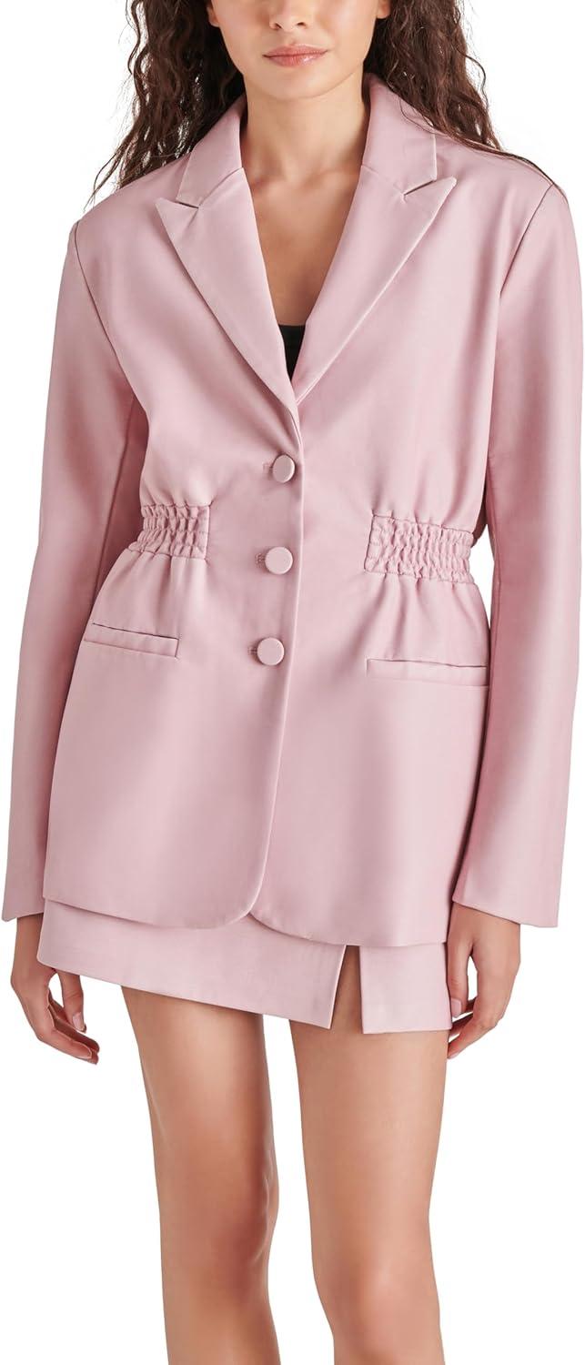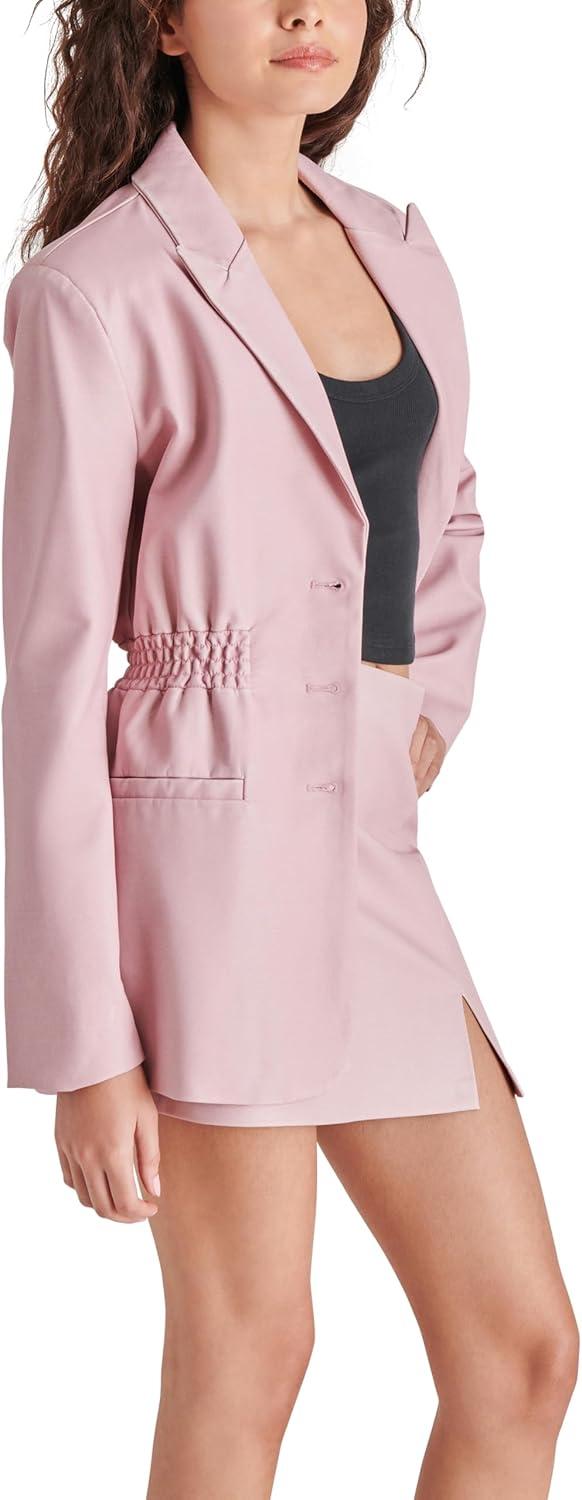 Business casual, but make it snatched. Frida is a tailored fit plaid blazer with flattering smocked cinch waist detail and three button closure.
