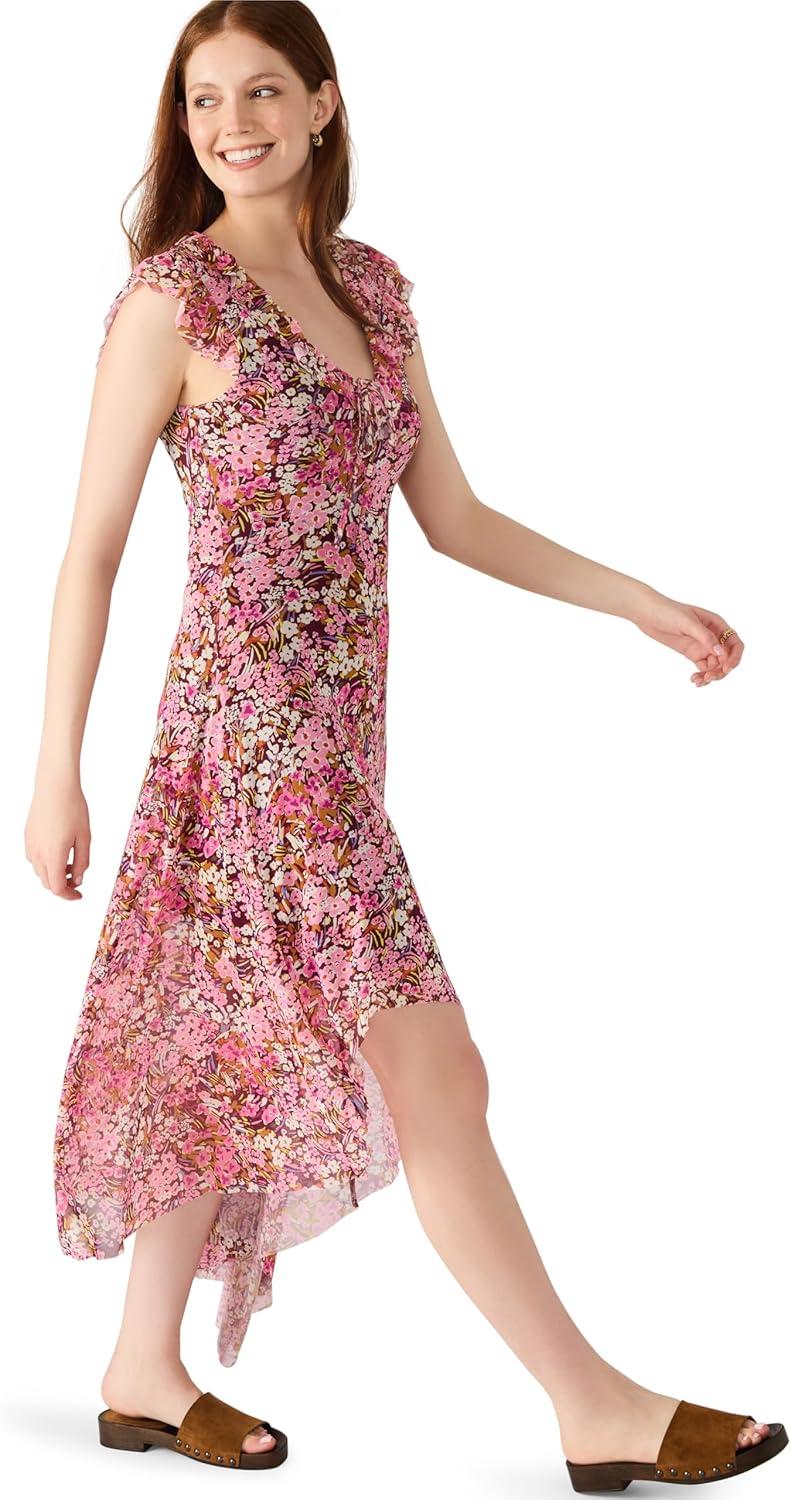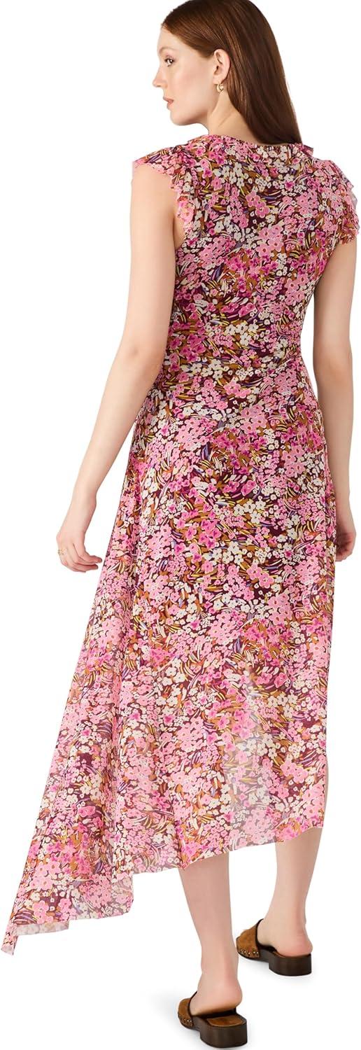 Asymmetric ruffled midi dress in “Floral Fresh” printed mesh