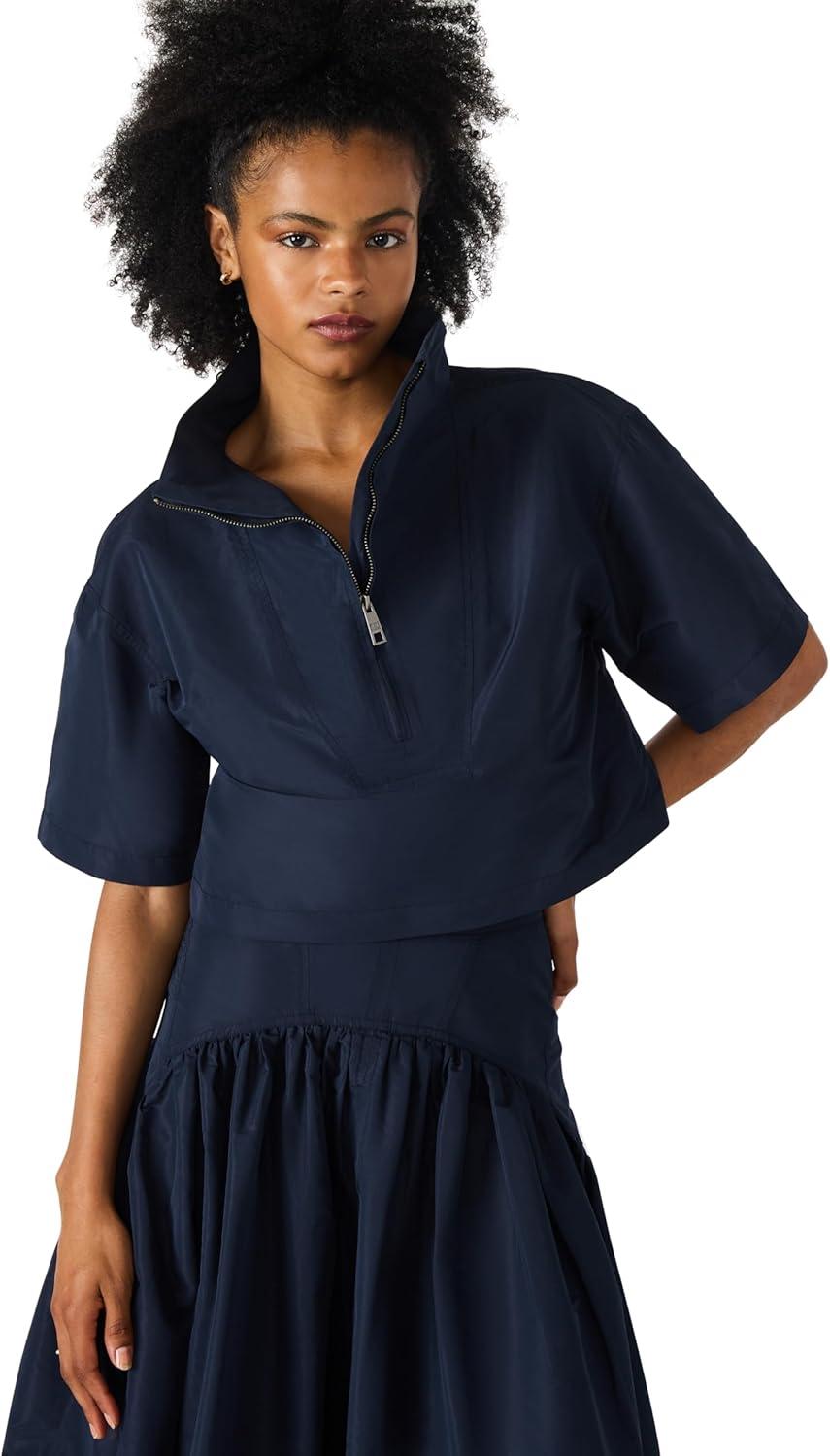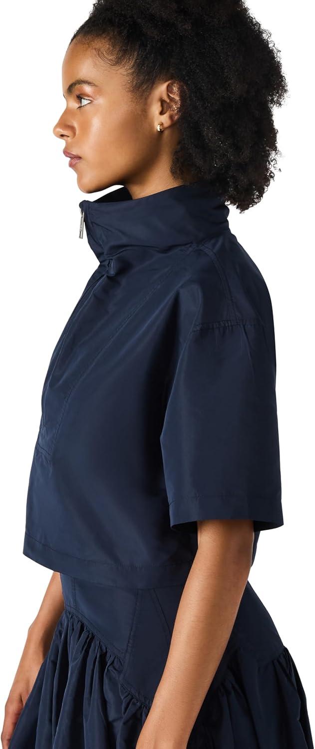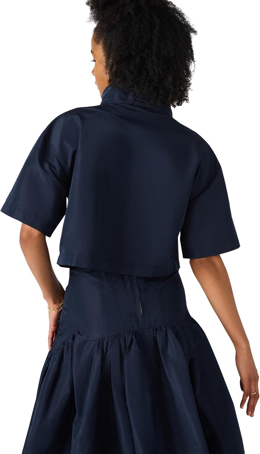 Zip front funnel neck short sleeve crop shirt in taffetta