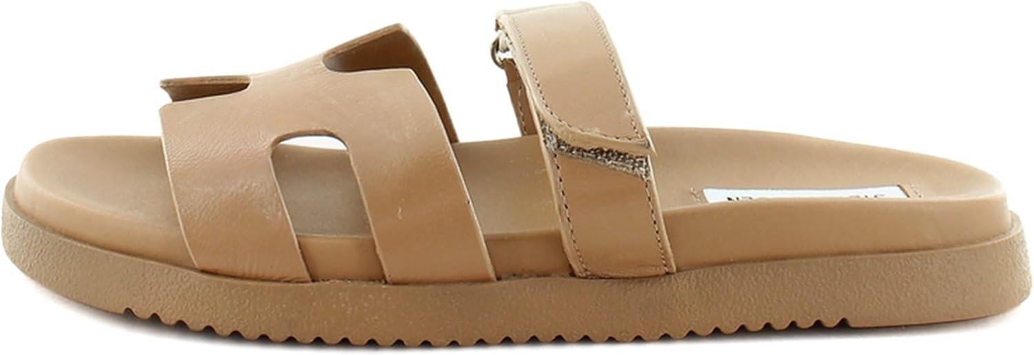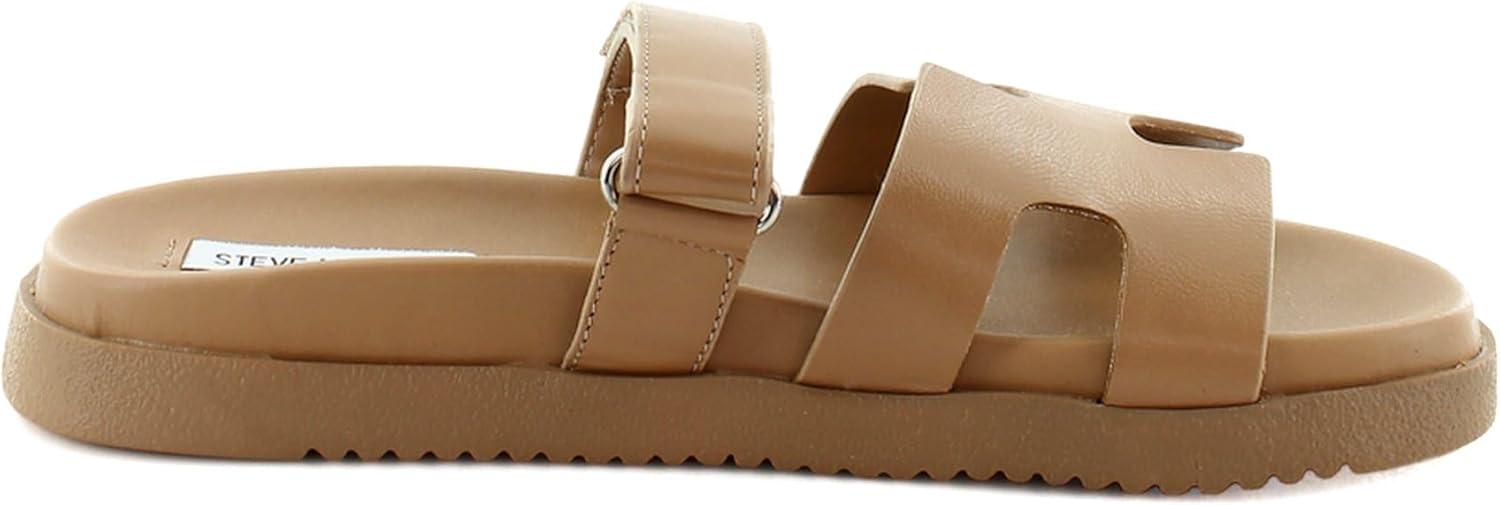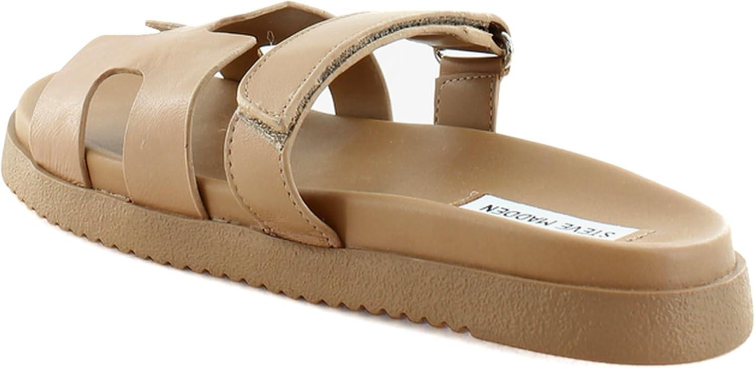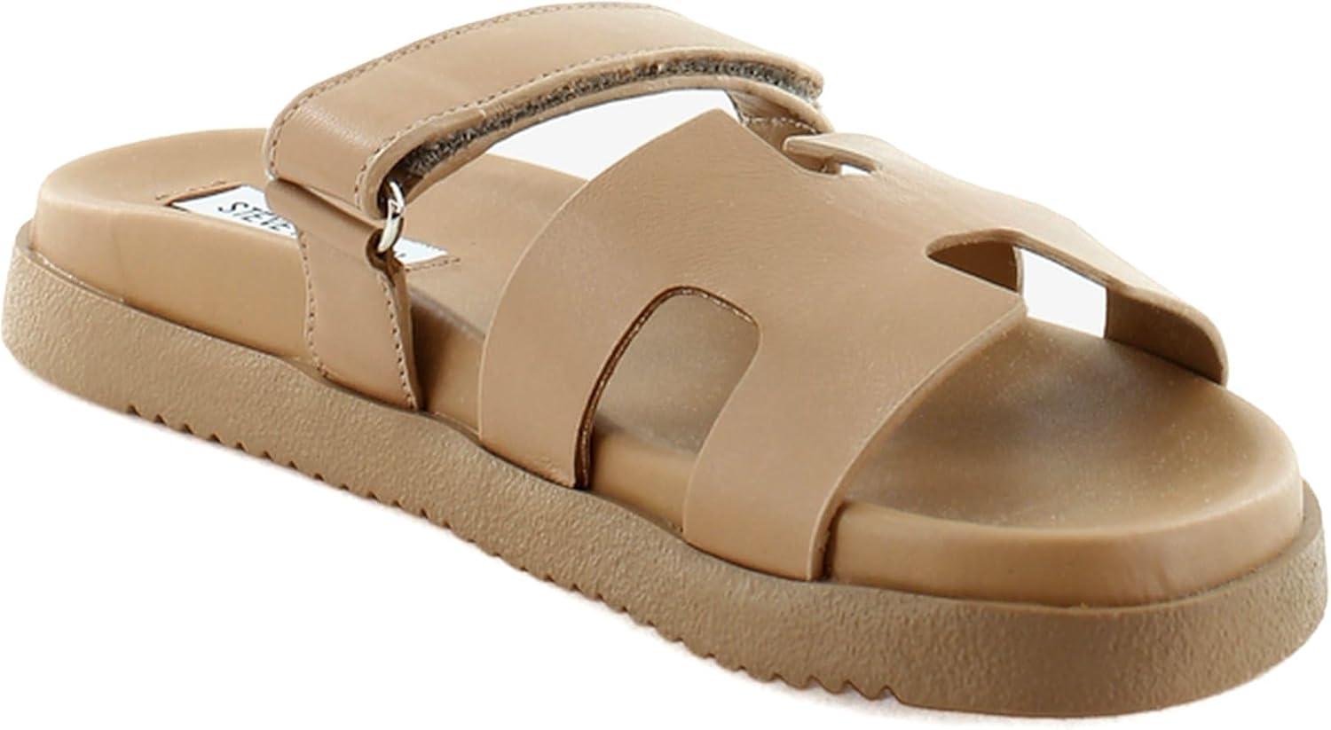 The leather MAYVEN slides feature comfy construction details like a molded footbed, a treaded flatform sole, and an adjustable top strap, plus a front strap with a geometric cutout design.