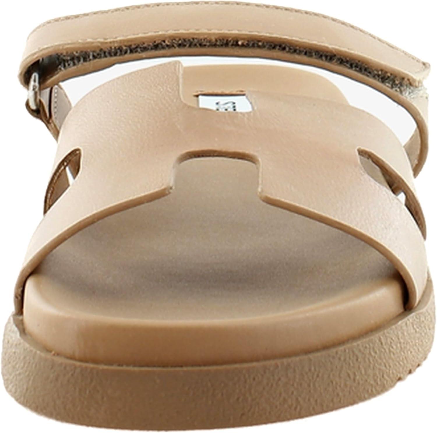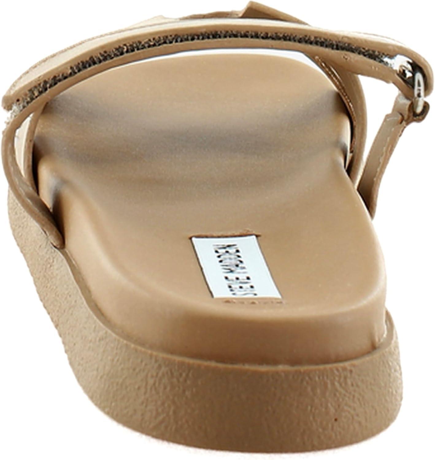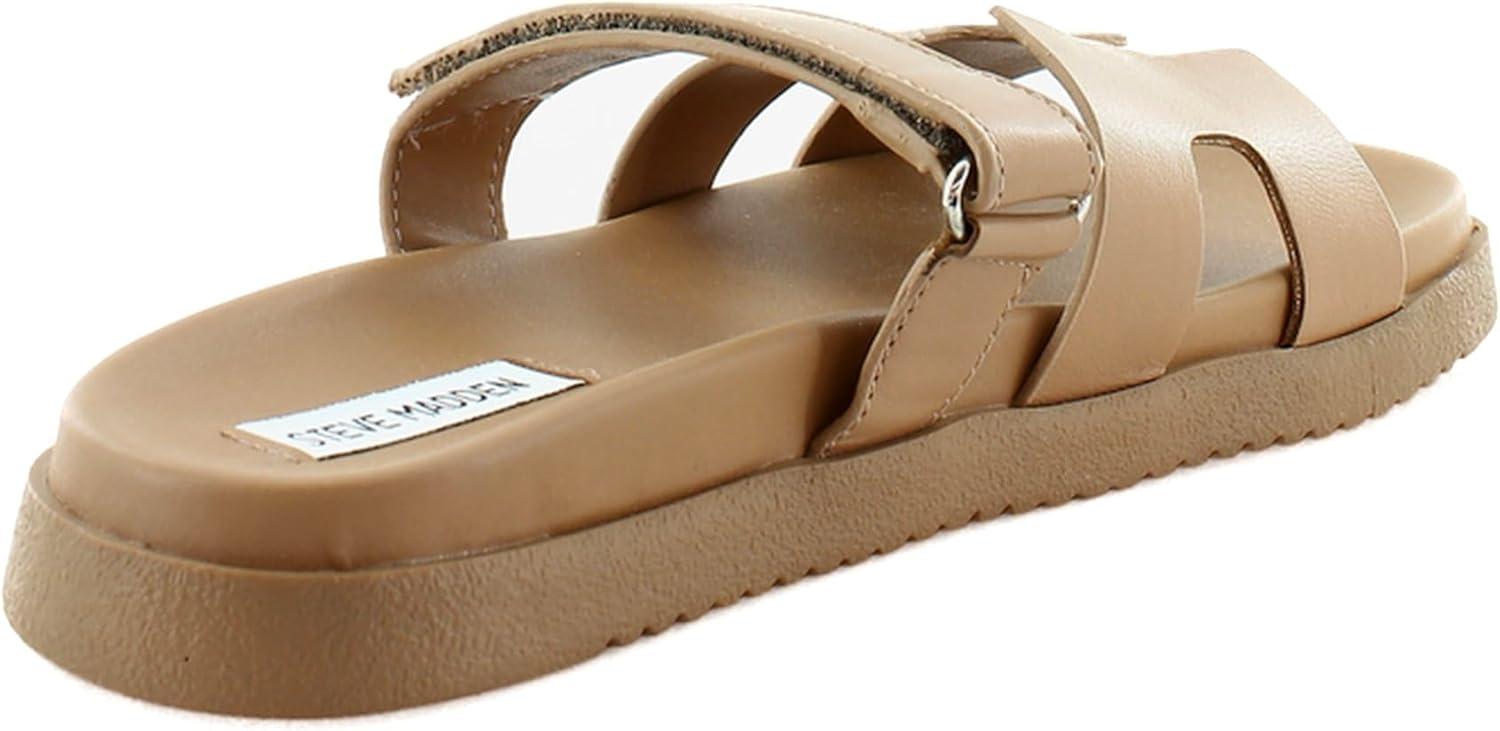 The leather MAYVEN slides feature comfy construction details like a molded footbed, a treaded flatform sole, and an adjustable top strap, plus a front strap with a geometric cutout design.