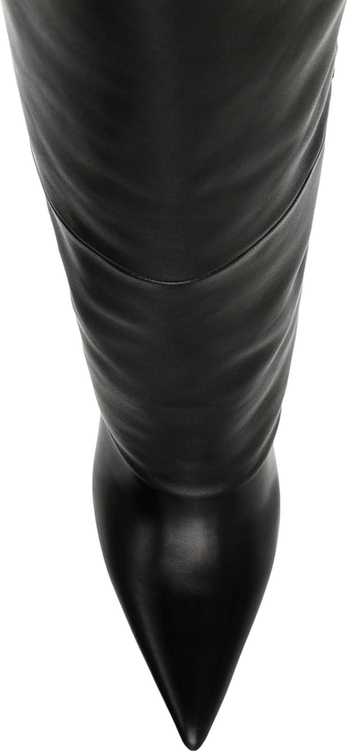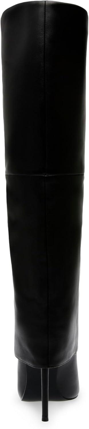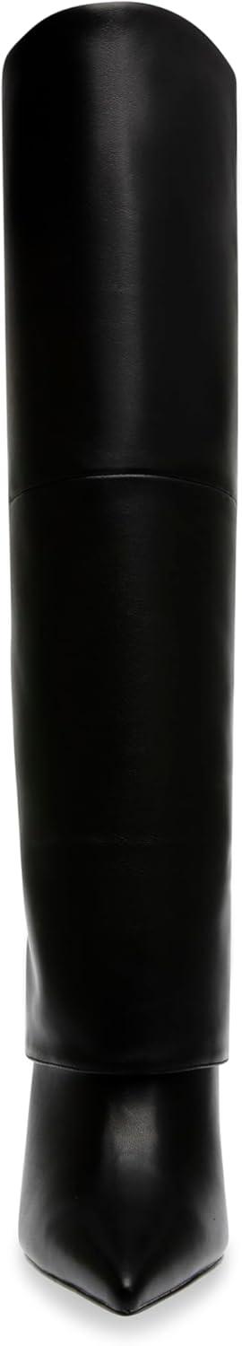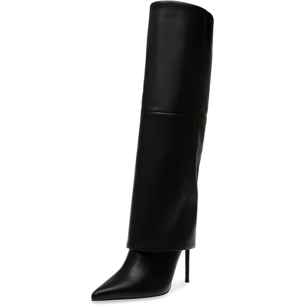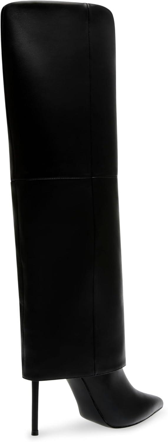 A stiletto heel and a pointed toe peek out from under the SMITH knee boot's foldover construction, highlighting a sleek and subtle monochrome look.