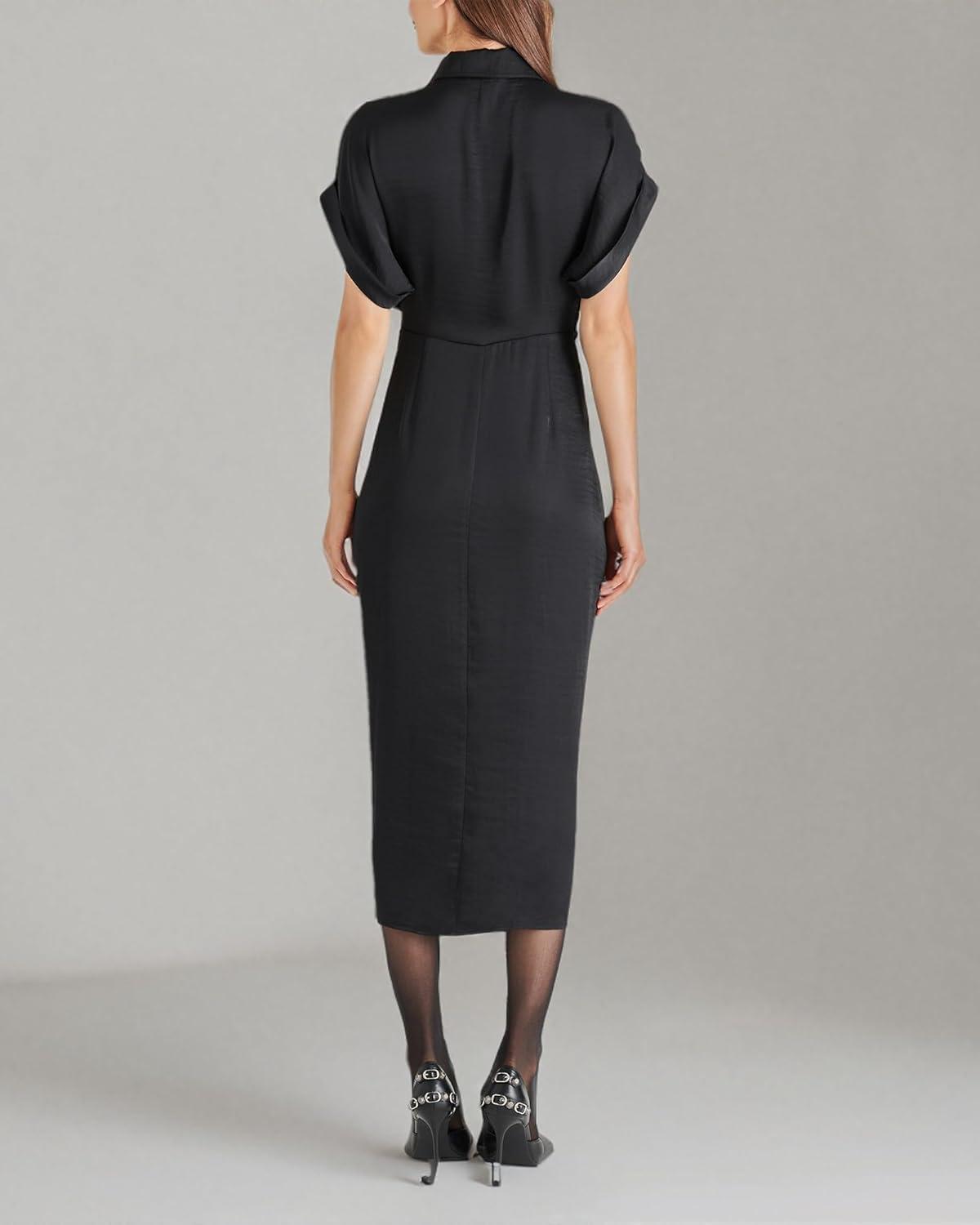 Goddess-tier drip. Tori is a button front midi dress with short rolled sleeves. This washed satin stunner redefines “shirt dress” with an ultra-flattering draped silhouette that ties at the waist.