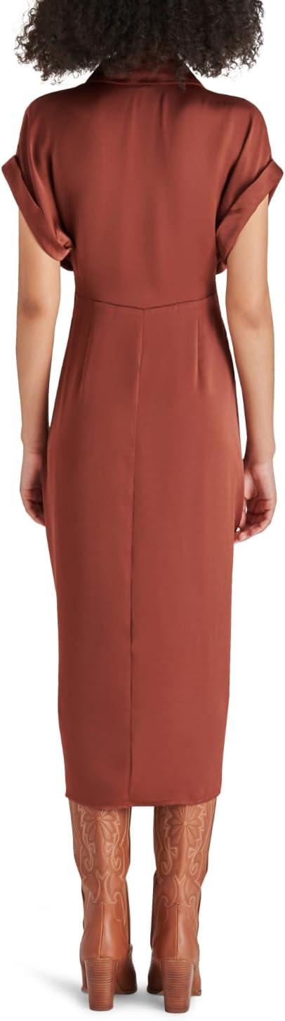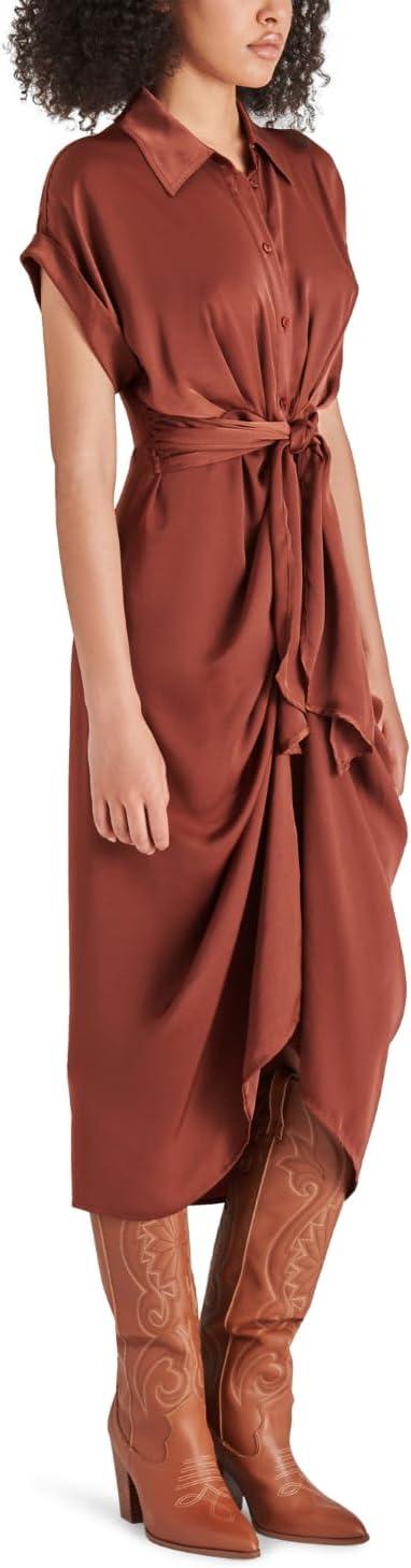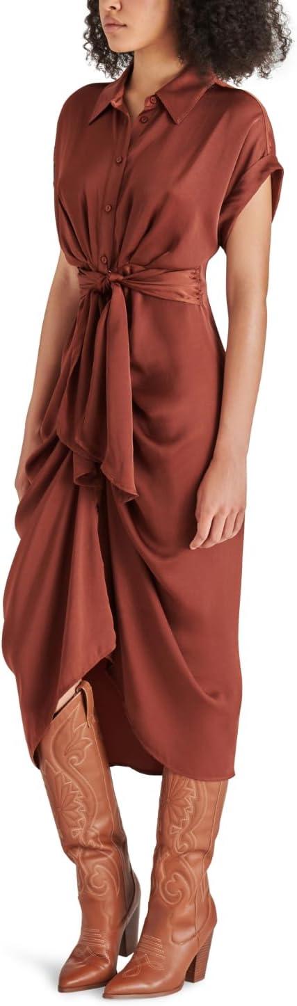 Goddess-tier drip. Tori is a button front midi dress with short rolled sleeves. This washed satin stunner redefines “shirt dress” with an ultra-flattering draped silhouette that ties at the waist.